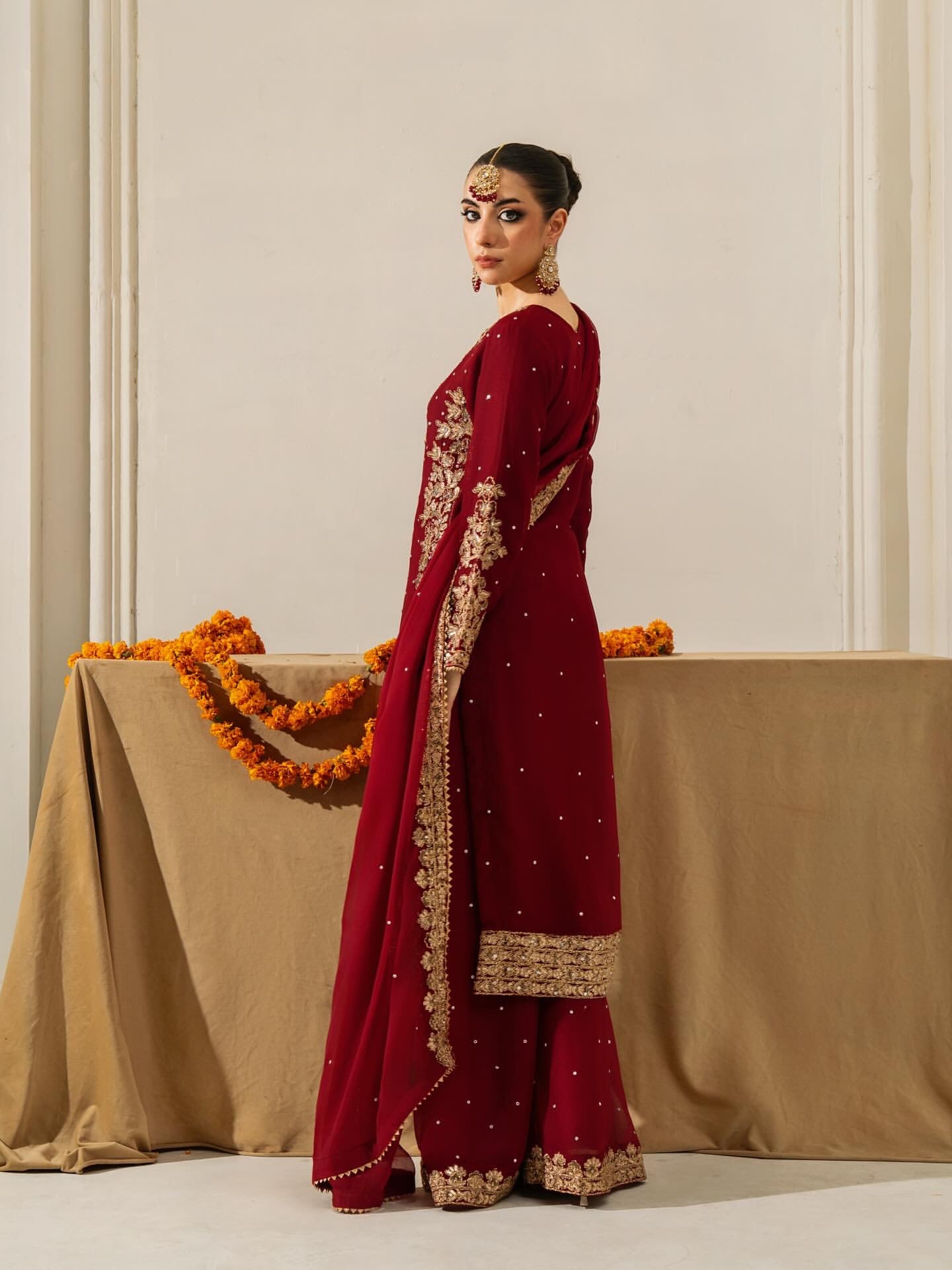 A premium set crafted from heavy georgette, featuring elegant coding sequence and moti work. Fully stitched and ready to wear, this gown set blends tradition with modern style, perfect for festive and special occasions.