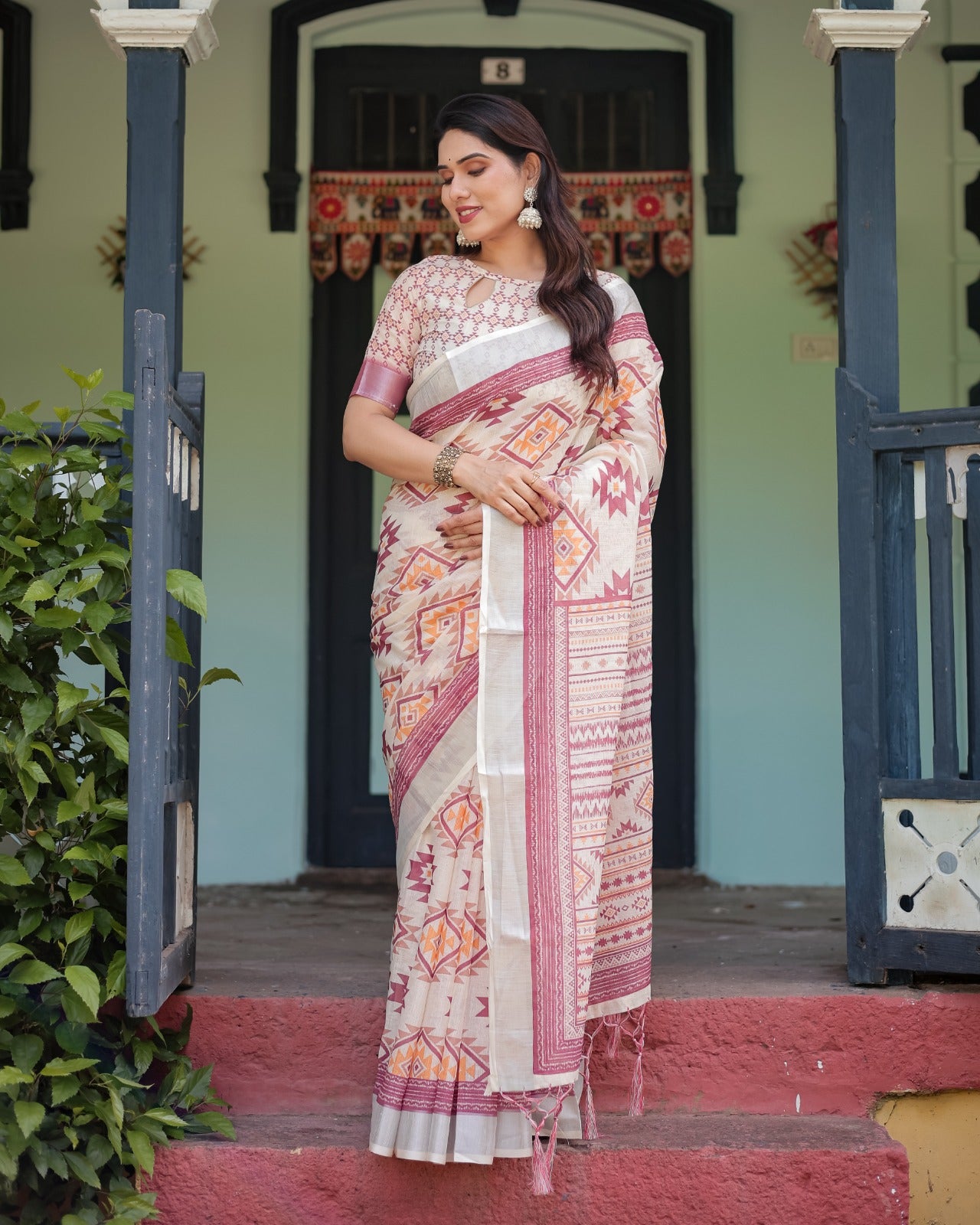 Off-White Linen Cotton Saree with Maroon Ikat Geometric Print, Silver Zari Border & Designer Blouse Piece